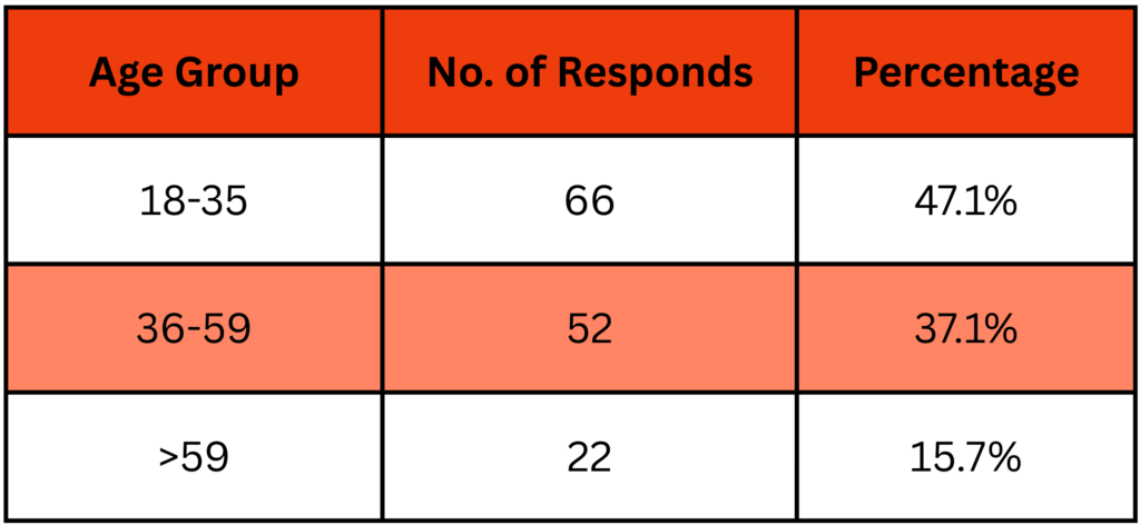 Age of the Respondents: The 18-35 group had the highest number of participants with 66 individuals. The 36-59 group had 52 participants. The above 60 years group had the lowest number of participants, with 22 individuals. The average age of the participants was 41.31.